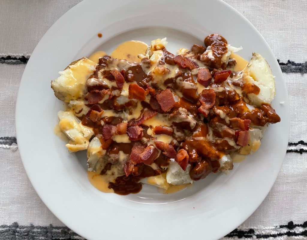For this baked potato, we used our left over cheese sauce from the Mexican Chicken and Cheese Sauce recipe which you can check out by clicking here. If you don’t have left over queso like we do, substitute store bought or top with your favorite shredded cheese. You can never go wrong with some shredded cheddar cheese sprinkled on top.