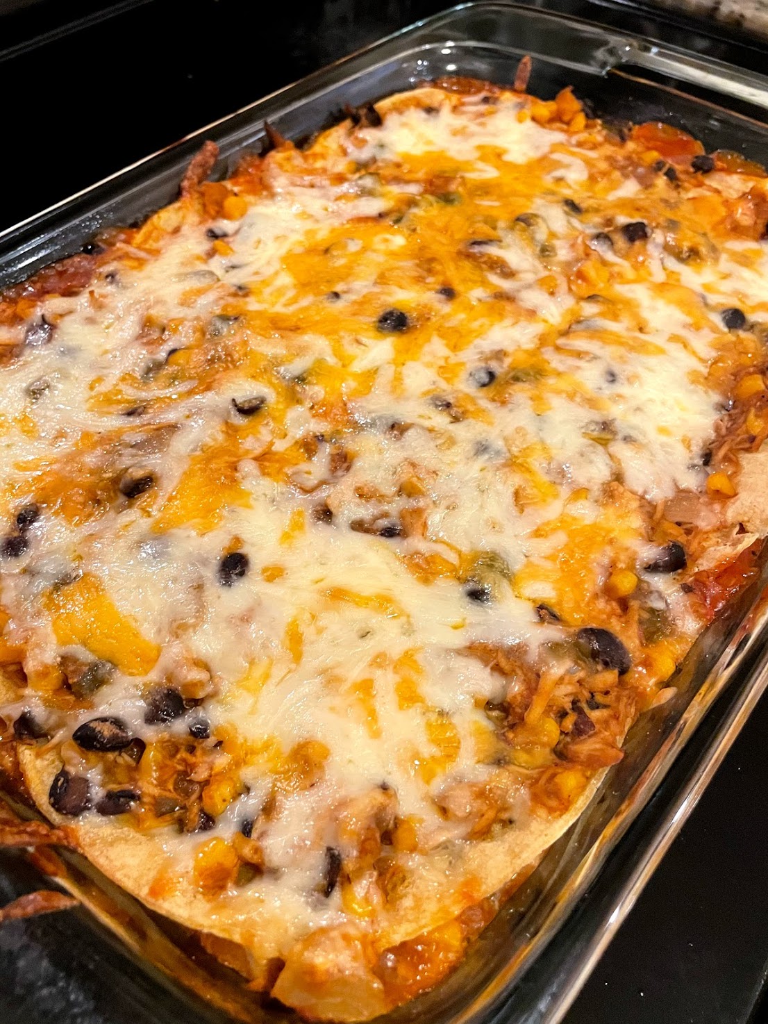 - Spread reserved 1/2 cup enchilada sauce on bottom of a 9″x13″. Layer 6 tortillas in pan, overlapping to cover the entire pan. Pour 1/3 of mixture over tortillas then top with 1/3 of cheeses. Top with another layer of tortillas and repeat to make two more layers. Finish with a layer of cheese.