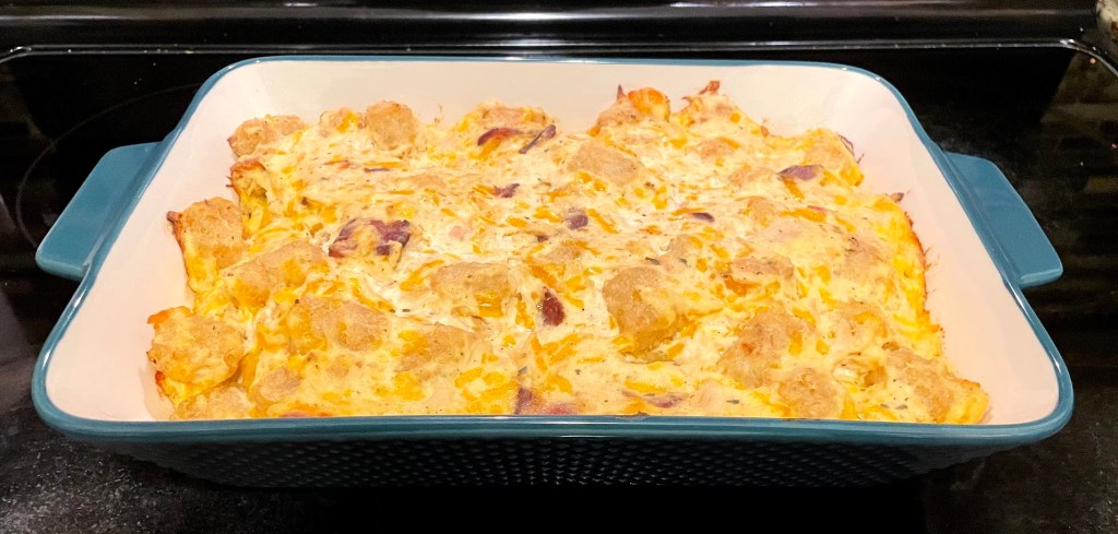 Enjoy this dish for dinner or even a brunch! With bacon and tater tots, no body will complain if you bring this to a potluck anytime of day. Comfort food knows no time!
