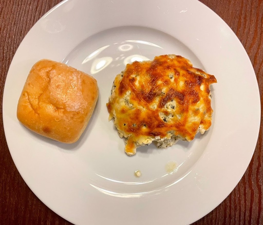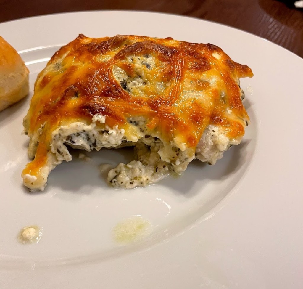 Since the chicken is packed with flavor from the pesto and cheeses, you can go simple with the side. We baked a few freezer rolls to eat alongside the chicken which was perfect to sop up the leftover pesto cream cheese.